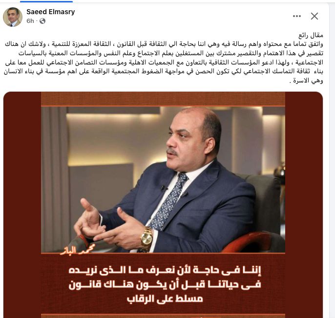 وتابع "المصري" موضحًا: واتفق تمامًا مع محتواه وأهم رسالة فيه وهي أننا بحاجة إلى الثقافة قبل القانون، الثقافة المعززة للتنمية، ولا شك أن هناك تقصيرًا في هذا الاهتمام والتقصير مشترك بين المشتغلين بعلم الاجتماع وعلم النفس والمؤسسات المعنية بالسياسات الاجتماعية.