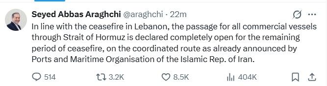 وكتب عباس عراقجي، وزير الخارجية الإيراني، على منصة X يوم الجمعة، أنه "تماشيُا مع وقف إطلاق النار في لبنان. المرور عبر مضيق هرمز مفتوح بالكامل أمام جميع السفن التجارية طوال الفترة المتبقية من وقف إطلاق النار".