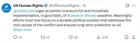 أعرب فولكر تورك، مفوض الأمم المتحدة السامي لحقوق الإنسان، عن أمله في أن يشكل وقف إطلاق النار لمدة عشرة أيام، الذي اتفقت عليه إسرائيل ولبنان، أساسًا لحل طويل الأمد.