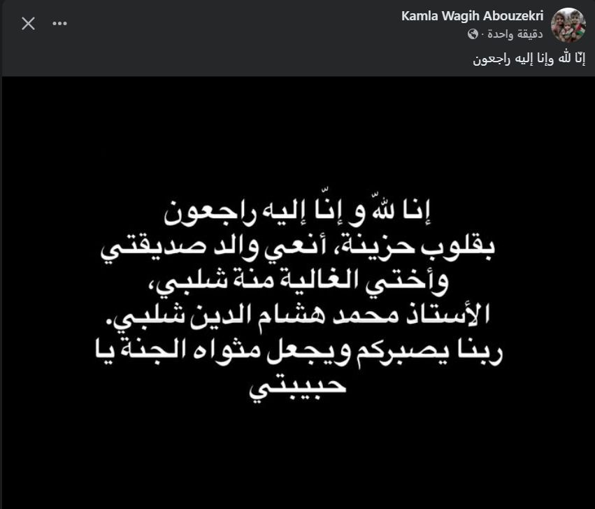 وشاركت كاملة أبو ذكري منشور عبر صفحتها الرسمية على فيس بوك، وعلقت قائلة: “انا لله وانا اليه راجعون، بقلوب حزينة، أنعي والد صديقتي واختي الغالية منة شلبي، الاستاذ محمد هشام الدين شلبي، ربنا يصبركم ويجعل مثواه الجنة يا رب”.
