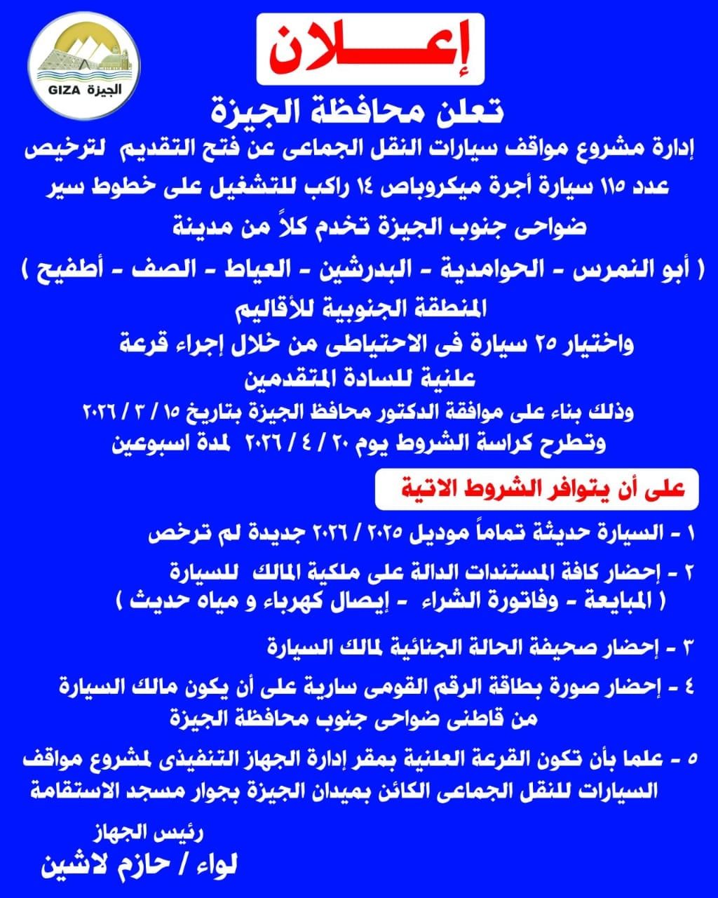 أعلنت محافظة الجيزة، فتح باب التقديم لترخيص عدد (115) سيارة أجرة ميكروباص سعة 14 راكبًا، للعمل على خطوط سير ضواحي جنوب الجيزة، والتي تشمل مدن: (أبو النمرس – الحوامدية – البدرشين – العياط – الصف – أطفيح)، بالإضافة إلى خطوط المنطقة الجنوبية للأقاليم.