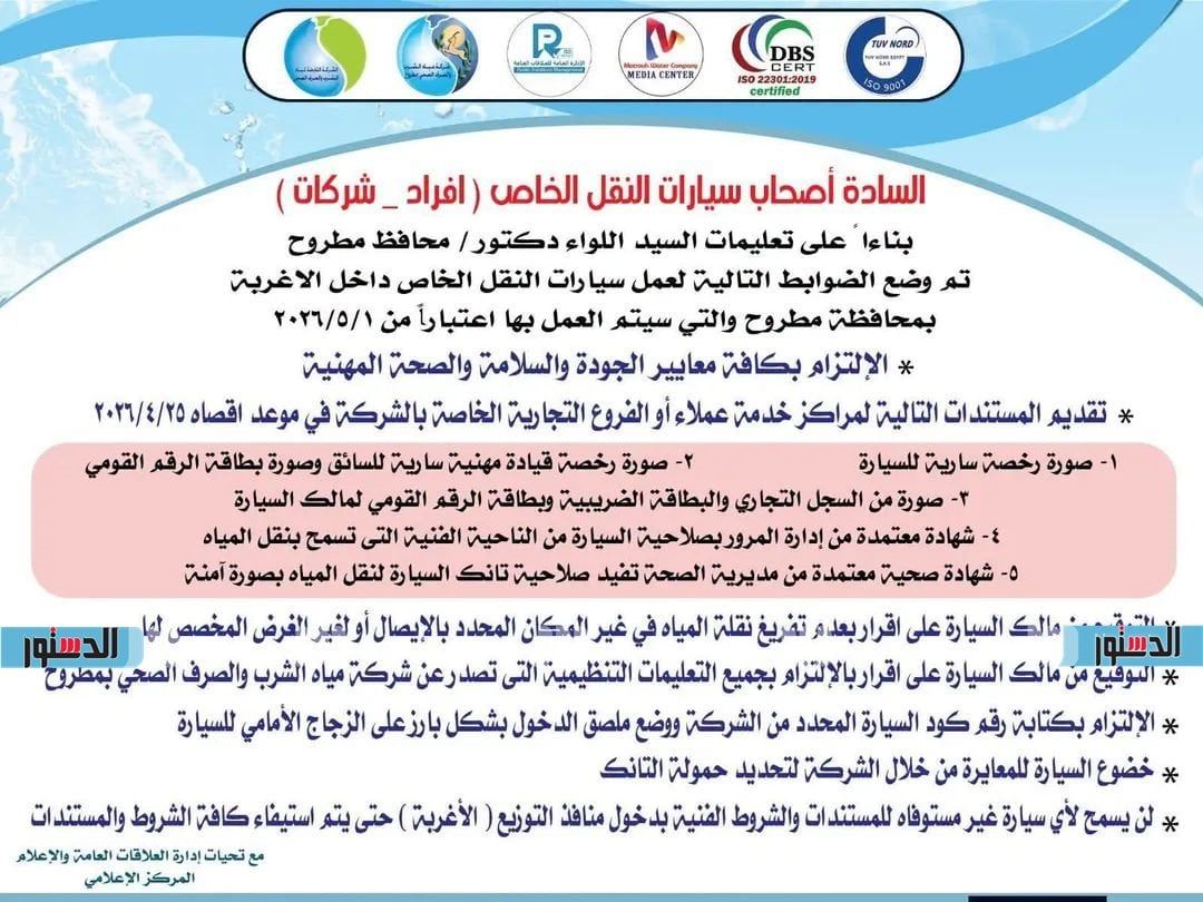 كما شملت الضوابط توقيع مالك السيارة على إقرار رسمي بعدم تفريغ حمولة المياه إلا في الأماكن المحددة بالإيصالات الرسمية أو استخدامها في غير الغرض المخصص لها، إلى جانب الالتزام الكامل بكافة التعليمات الصادرة عن شركة مياه الشرب والصرف الصحي بمطروح.