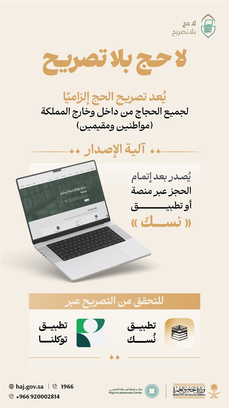 أصدرت وزارة الحج والعمرة السعودية تنبيهًا إلى جميع الحجاج الوافدين إليها خلال موسم الحج المقبل بأنه لا حج بدون تصريح، موضحة أن تصريح الحج يعد إلزاميًا لجميع الحجاج سواء القادمين من خارج المملكة العربية السعودية أو من الداخل سواء مواطنين سعوديين أو مقيمين بالمملكة.