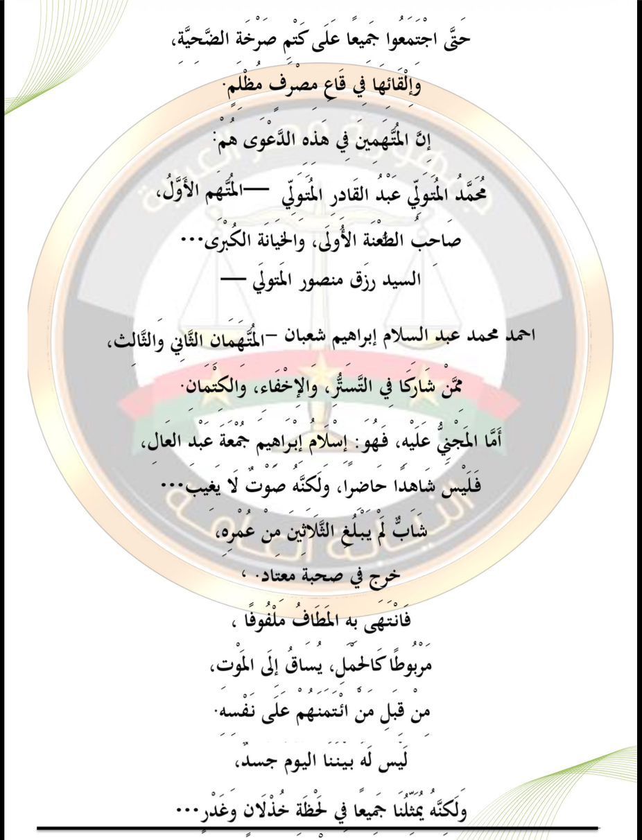 واضاف قائلا : إنهم في هذه الدعوى المتهم الأول محمد المتولي عبد القادر المتولي والمتهم الثاني السيد رزق منصور المتولي والمتهم الثالث محمد عبد السلام إبراهيم شعبان أما المجني عليه إسلام إبراهيم جمعة عبد العال شاب لم يبلغ من العمر إلا القليل خرج في صحبةٍ معتادة، فانتهى به المطاف مربوطًا، يُساق إلى الموت في لحظةٍ، صار الصديق قاتلًا، والرفيق خائنًا، أي خيانة هذه؟