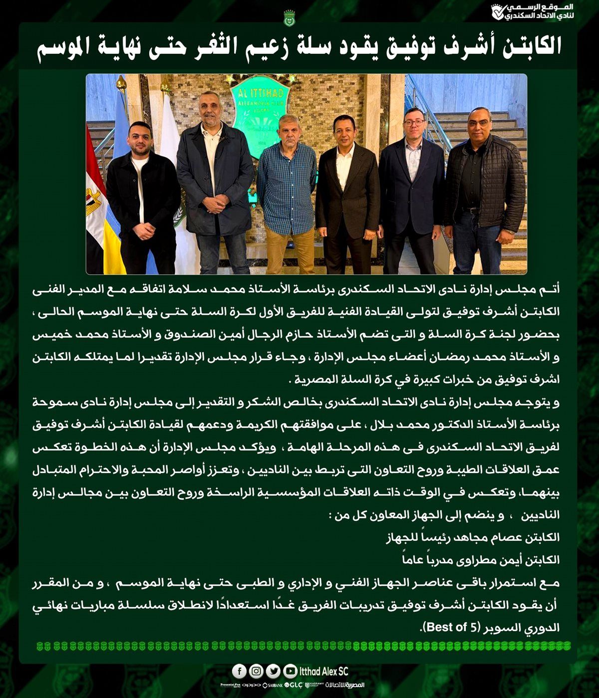 وفي السياق ذاته، يتوجه مسئولو زعيم الثغر بخالص الشكر والتقدير إلى نظيرهم مسئولو نادي سموحة برئاسة الدكتور محمد بلال، على موافقتهم ترك أشرف توفيق لقيادة فريق سلة الاتحاد، في هذه المرحلة الهامة، حتى نهاية الموسم الجاري (2025/2026).