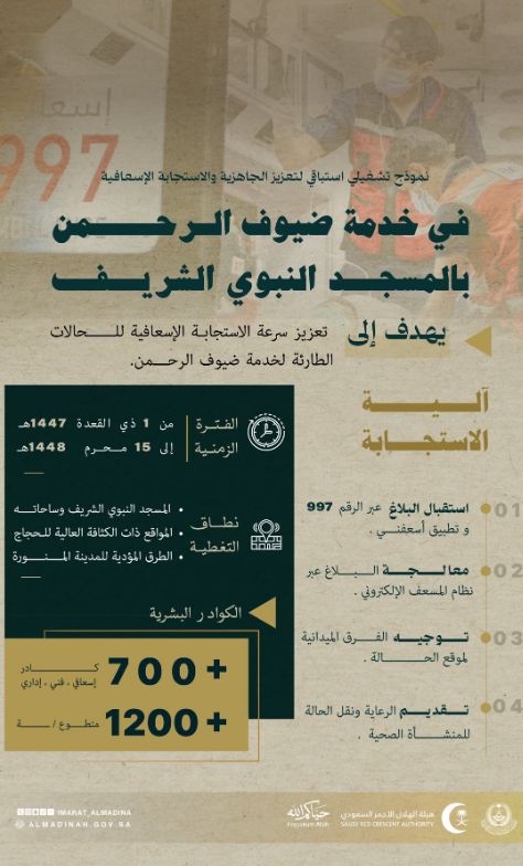 هذا وأصدرت هيئة الهلال الأحمر السعودي بمنطقة المدينة المنورة الخطة التشغيلية لموسم الحج المقبل، وذلك في إطار الاستعدادات المبكرة لرفع جاهزية الخدمات الإسعافية المقدمة لضيوف الرحمن، وبناءً على ما تم اعتماده من خطط تشغيلية متكاملة.