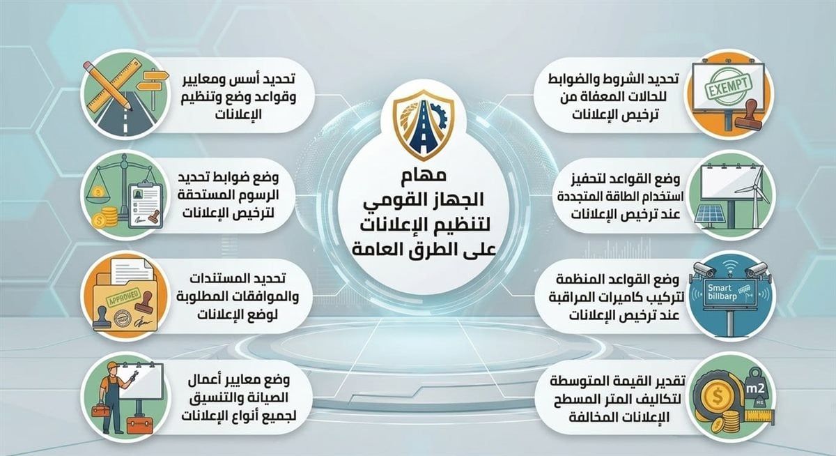 من الجدير بالذكر، أن الجهاز القومي لتنظيم الإعلانات على الطرق العامة التابع لرئاسة مجلس الوزراء، أُنشئ بقرار رئيس مجلس الوزراء رقم 1440 لسنة 2022، ويترأس مجلس إدارته رئيس مجلس الوزراء أو من ينيبه، ويضم في عضويته عددًا من الوزراء المعنيين، ويتولى وزير الإسكان والمرافق والمجتمعات العمرانية “مقرر المجلس” إصدار القرارات المنظمة لتشكيل الأمانة الفنية ونظام عملها، فيما يتم تعيين الرئيس التنفيذي للجهاز ونائبه بقرار من رئيس مجلس الوزراء بناءً على ترشيح وزير الإسكان.