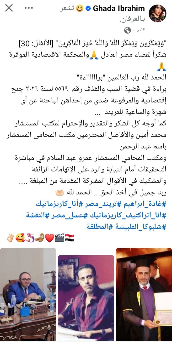 وفي أول تعليق لها عقب النطق بالحكم، استهلت غادة إبراهيم منشورها بالآية القرآنية الكريمة: "وَيَمْكُرُونَ وَيَمْكُرُ اللَّهُ وَاللَّهُ خَيْرُ الْمَاكِرِينَ"، معربة عن امتنانها الكبير للقضاء المصري وثقتها الراسخة في منظومة العدالة. وأكدت أن ما مرت به لم يكن مجرد خلاف شخصي عابر، بل وصفته بأنه محاولة متعمدة لاستهدافها وتشويه سمعتها، مشيرة إلى أن الدعوى رفعت ضدها من قبل شخصية وصفتها بأنها "باحثة عن الشهرة وتسعى لتصدر التريند".