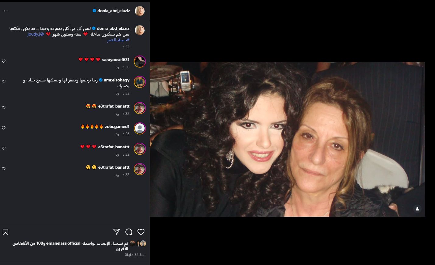 كما شاركت الفنانة دنيا عبد العزيز، خلال وقت سابق، صورة لها برفقه والدتها الرحلة، عبر صفحتها الرسمية على موقع التواصل الاجتماعي إنستجرام وعلقت عليه: رحيلك غربة لا نتنهي، خمسة وستون شهر.