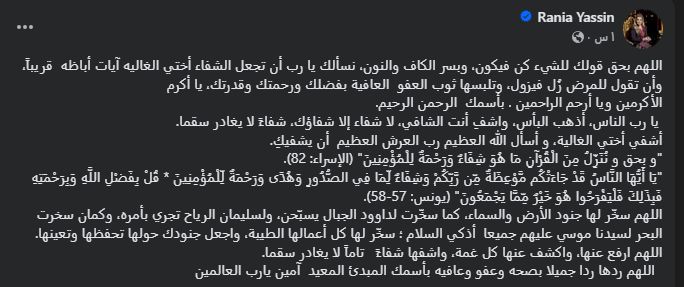 وتابعت الفنانة رانيا محمود ياسين في منشورها: الناس، أذهب البأس، واشفِ أنت الشافي، لا شفاء إلا شفاؤك، شفاءً لا يغادر سقما، اشفِ أختي الغالية، وأسأل الله العظيم رب العرش العظيم أن يشفيك، ونشرت عددا من آيات القرآن وبحق و نُنَزِّلُ مِنَ الْقُرْآنِ مَا هُوَ شِفَاءٌ وَرَحْمَةٌ لِلْمُؤْمِنِينَ، ، يَا أَيُّهَا النَّاسُ قَدْ جَاءَتْكُم مَّوْعِظَةٌ مِّن رَّبِّكُمْ وَشِفَاءٌ لِّمَا فِي الصُّدُورِ وَهُدًى وَرَحْمَةٌ لِّلْمُؤْمِنِينَ * قُلْ بِفَضْلِ اللَّهِ وَبِرَحْمَتِهِ فَبِذَلِكَ فَلْيَفْرَحُوا هُوَ خَيْرٌ مِّمَّا يَجْمَعُونَ.