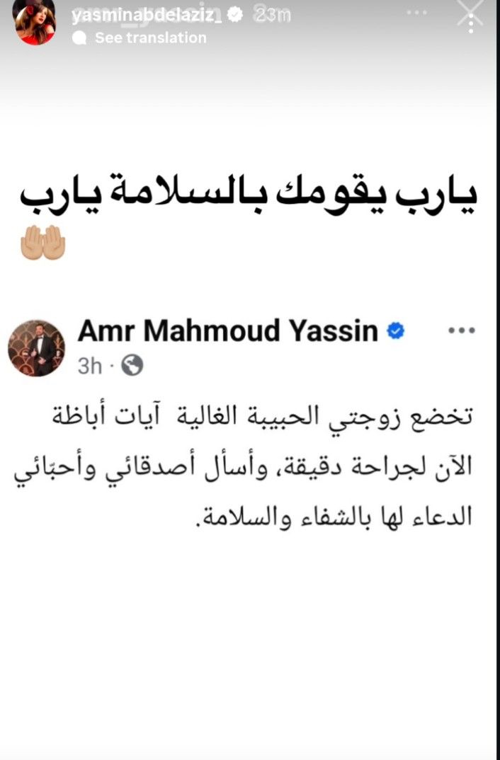 نشرت الفنانة ياسمين عبد العزيز عبر خاصية “الستوري” على حسابها الرسمي في موقع انستجرام رسالة قصيرة تحمل دعوة من القلب لزوجة الكاتب عمرو محمود ياسين ورصدها موقع تحيا مصر، قالت فيها: "ربنا يقومك بالسلامة يا رب"، في لفتة إنسانية نالت تفاعلًا واسعًا من جمهورها ومتابعيها الذين شاركوها الدعاء لآيات بالشفاء.