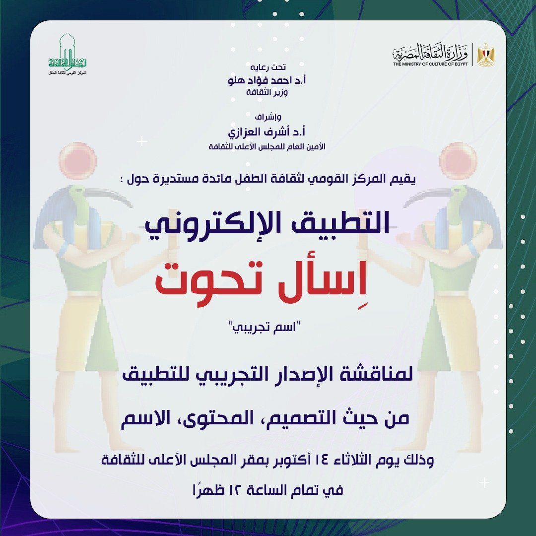 يقيم المركز القومي لثقافة الطفل، في الثانية عشرة ظهر اليوم الثلاثاء، مادة مستديرة حول التطبيق الإلكتروني "اسأل تحوت" اسم تجريبي وذلك بمقر المجلس الأعلى للثقافة، بساحة الأوبرا بأرض الجزيرة.