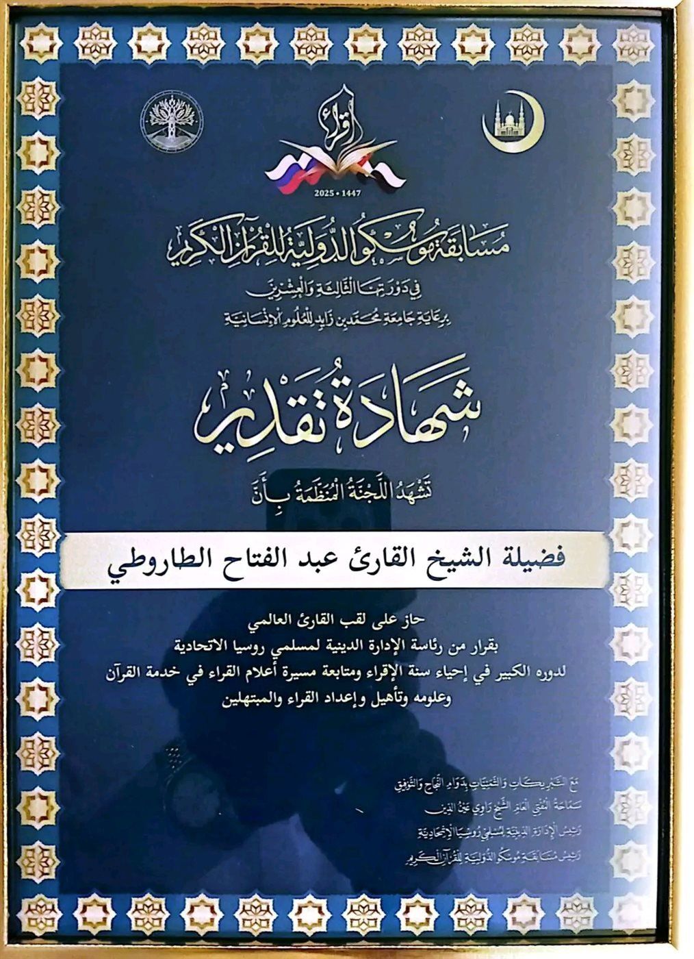 روسيا تكرم القارئ عبدالفتاح الطاروطي كأفضل شخصية قرآنية عالميًا