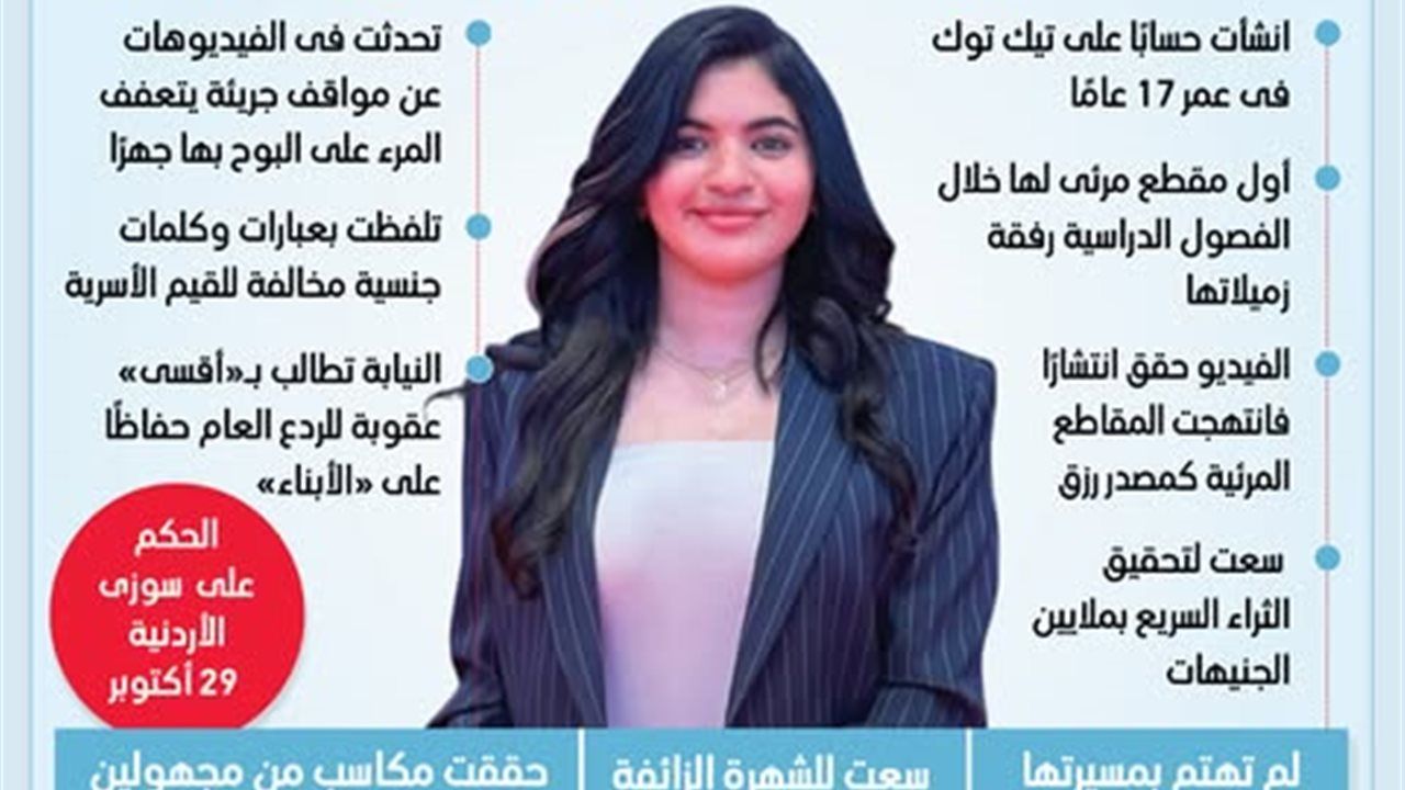 ألقت مرافعة نارية النيابة العامة أمام المحكمة الاقتصادية لردع البلوجر سوزي الأردنية في نشر مقاطع مرئية تضمنت ألفاظ نابية وعبارات خادشة للحياء العام.