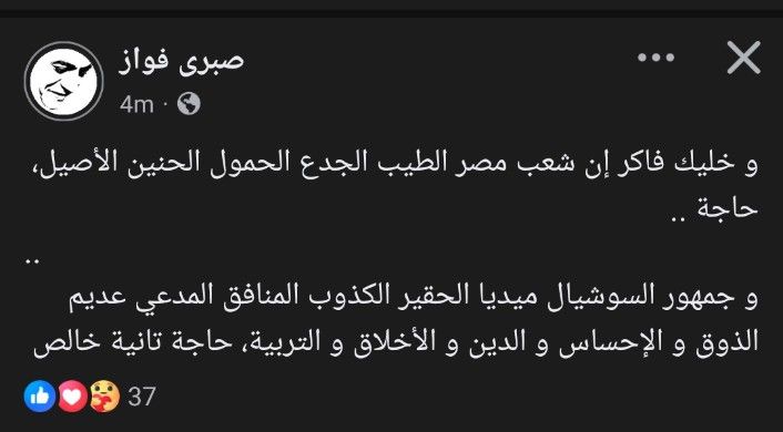 وكتب صبري فواز عبر حسابه الشخصي منشورًا يعبر فيه عن استيائه من بعض التصرفات التي رآها على منصات التواصل، قائلًا وفقا لما رصده موقع تحيا مصر: "شعب مصر الطيب الجدع الحمول الحنين الأصيل حاجة، وجمهور السوشيال ميديا الحقير الكذوب المنافق المدعي عديم الذوق والإحساس والدين والأخلاق والتربية حاجة تانية خالص"، وتصريحات فواز أثارت تفاعلًا واسعًا بين مؤيد ومعارض، خاصة أنها جاءت بعد ظهوره الأخير في مهرجان الجونة السينمائي في دورته الثامنة، حيث شارك في العرض الخاص لفيلم "السادة الأفاضل"، وهو فيلم يُعرض ضمن فعاليات المهرجان، اللافت في هذا الظهور كان اصطحابه لابنته، التي ظهرت للمرة الأولى أمام عدسات الكاميرات، مما جعلها محط أنظار وسائل الإعلام والجمهور على حد سواء.