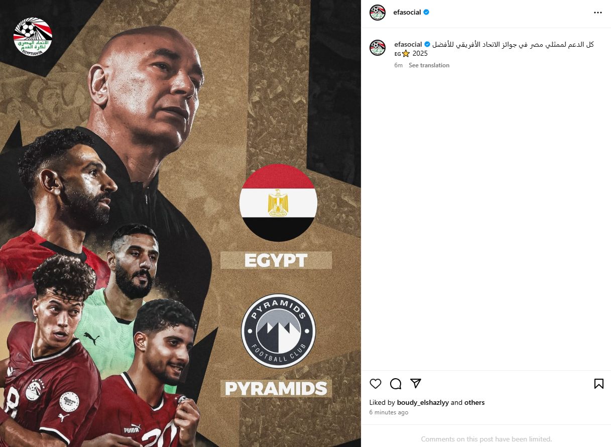 تحيا مصر، وكتبت الصفحة الرسمي للاتحاد المصري عبر"إنستجرام": كل الدعم لممثلي مصر في جوائز الاتحاد الأفريقي للأفضل 2025.