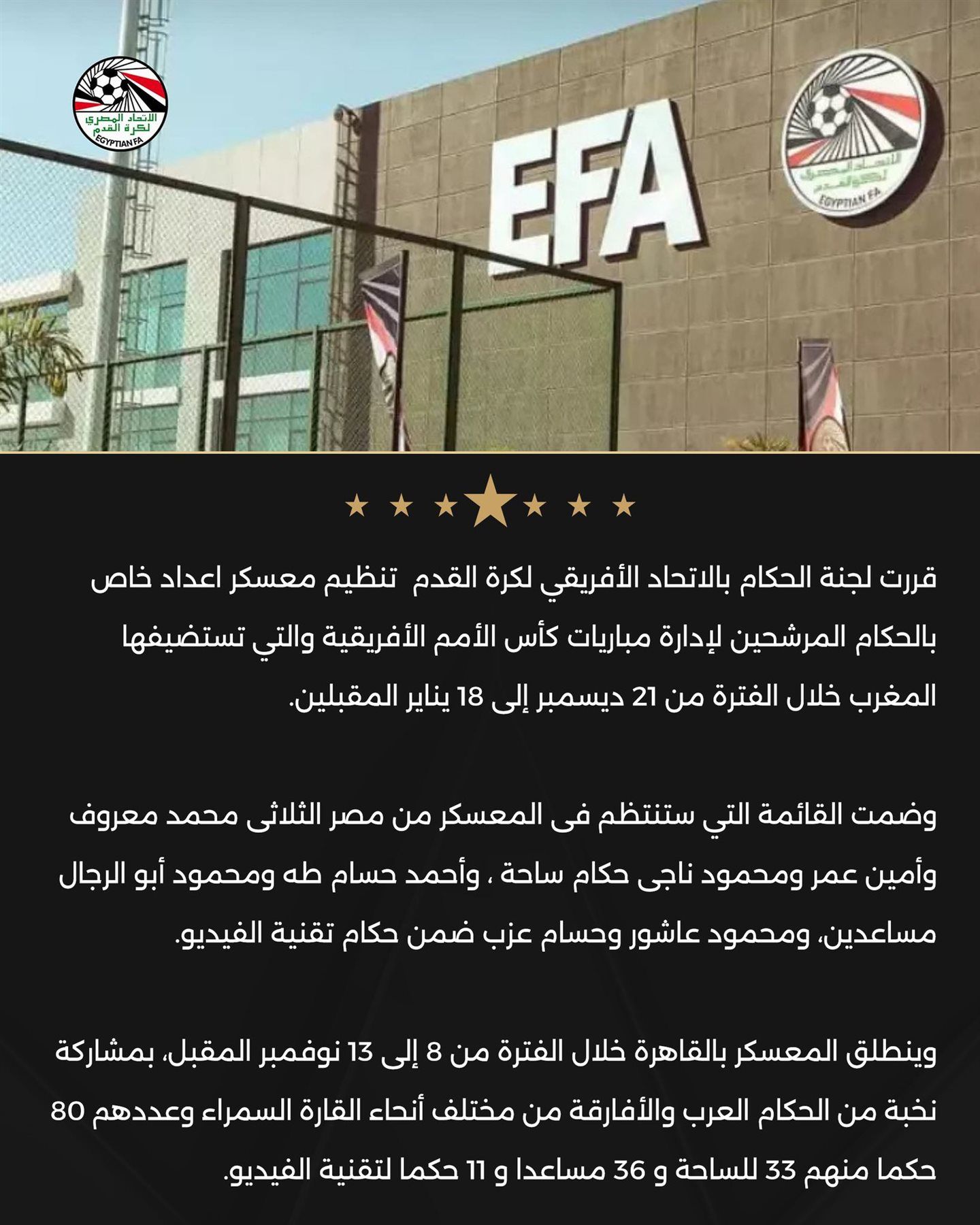 ومن المقرر أن ينطلق المعسكر في القاهرة خلال الفترة من 8 إلى 13 نوفمبر المقبل، بمشاركة نخبة من أبرز الحكام في القارة السمراء، حيث يبلغ عدد المشاركين 80 حكمًا، منهم 33 حكم ساحة، و36 حكمًا مساعدًا، و11 حكمًا لتقنية الفيديو.