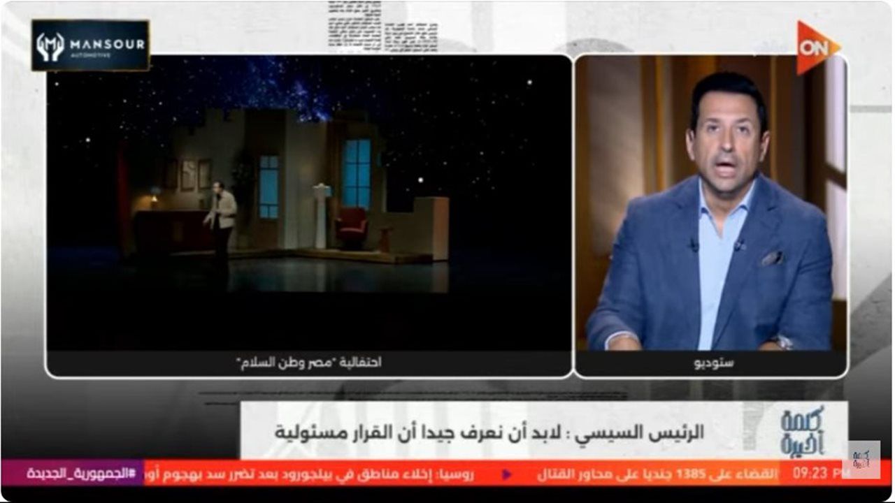 قال الإعلامي أحمد سالم، خلال تقديم حلقة اليوم من برنامج "كلمة أخيرة" المُذاع عبر فضائية "on"، إن احتفالية "مصر وطن السلام" المقامة بالعاصمة الإدارية الجديدة، تعكس مكانة مصر التاريخية ودورها المحوري في نشر ثقافة السلام حول العالم.