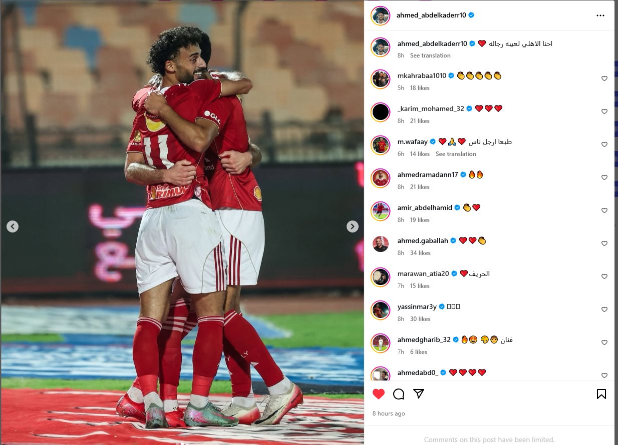 تحيا مصر، وكتب أحمد عبد القادر عبر حسابه الرسمي"انستجرام": احنا الأهلي لعيبة رجالة".