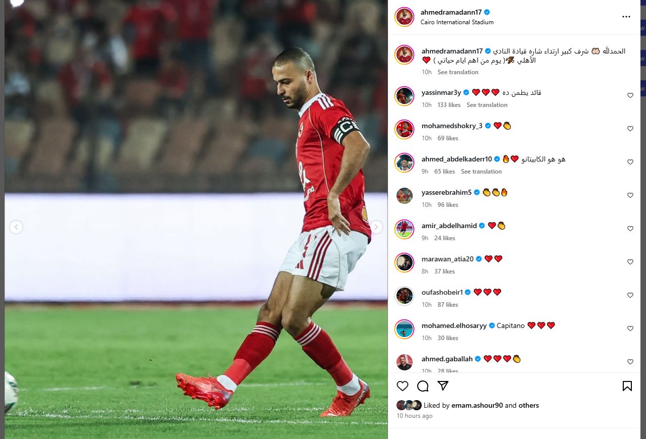 تحيا مصر، وكتب أحمد رمضان بيكهام عبر حسابه الرسمي"انستجرام": الحمدلله شرف كبير ارتداء شارة قيادة النادي الأهلي يوم من أهم أيام حياتي".