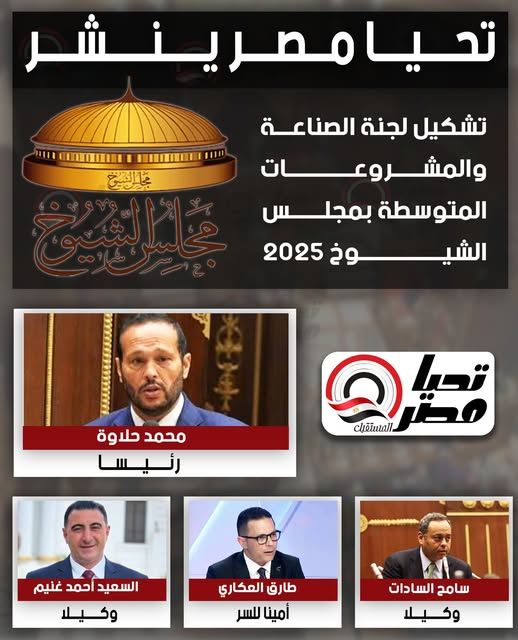 ينشر تحيا مصر تشكيل لجنة الصناعة والمشروعات المتوسطة والصغيرة بمجلس الشيوخ، حيث جاءت برئاسة النائب محمد حلاوة، والوكيلين سامح السادات وطارق العكاري، والسعيد أحمد غنيم أمين سر اللجنة.