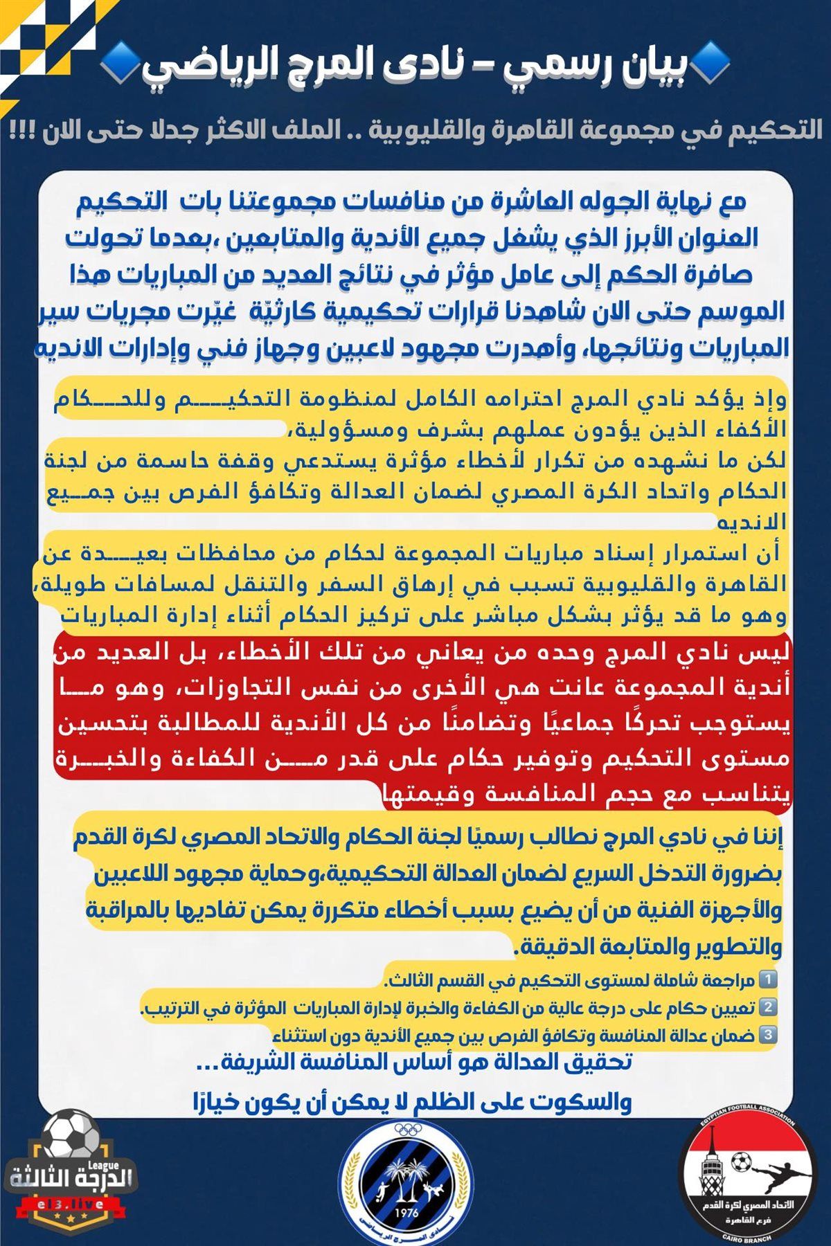 أصدر مسؤولو مجلس إدارة نادي المرج الرياضي بيان رسمي بشأن أخطاء التحكيم المتكررة بدوري القسم الثالث عقب نهاية مباريات الفريق الأول لكرة القدم بالنادي بالجولة العاشرة للمجموعة السادسة مجموعة أندية القاهرة والقليوبية والتي إنتهت بالتعادل الإيجابي بهدفين أمام فريق إيزي سبورت ووصول الفريق إلي النقطة 18 ليحتل المركز الرابع للمجموعة.