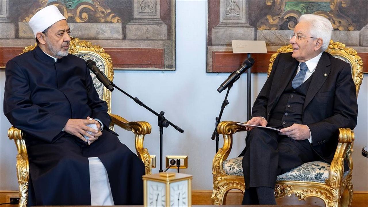 من جانبه، أكد الرئيس الإيطالي سيرجيو ماتاريلا تقديره لمواقف شيخ الأزهر في نشر قيم السلام والأخوة الإنسانية، وإعجابه بعلاقة الصداقة التي جمعت فضيلته بقداسة البابا فرنسيس الراحل، مشيدًا بوثيقة الأخوة الإنسانية التي وقعها الرمزان الدينيان الكبيران في فبراير 2019 بأبوظبي، مصرحًا: «لقد أثبت الواقع المعاصر الحاجة الماسّة إلى هذه الوثيقة التي تجاوزت حدود المكان، وأصبحت علامة بارزة في مجال السلام العالمي والحوار بين الأديان».