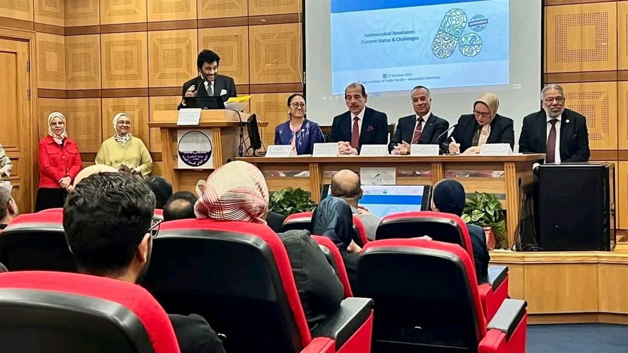 نظم المعهد العالي للصحة العامة بـجامعة الإسكندرية، ندوة تحت عنوان "مقاومة مضادات الميكروبات: الوضع الحالي والتحديات"، بحضور الدكتور عمرو قنديل نائب وزير الصحة والسكان، والدكتور محمد يحيى بدران، وكيل وزارة الصحة بالإسكندرية، ونخبة من الخبراء والمختصين في مجال الصحة العامة.