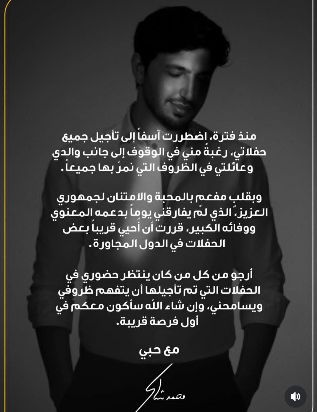 وأكد محمد فضل شاكر في بيان له نشره عبر مواقع التواصل الاجتماعي المختلفة، أنه أجل جميع حفلاته مؤقتًا رغبةً في الوقوف إلى جانب والده وعائلته، مشيرًا إلى أن هذا القرار جاء تقديرًا للظروف الصعبة التي تمر بها العائلة، ووجه الفنان شكره وامتنانه لجمهوره الذي ظل يسانده ويدعمه خلال فترة غيابه، مؤكدًا أنه يعمل حاليًا على تنظيم حفلاته المقبلة في عدد من الدول المجاورة، وقال في بيانه الذي رصده موقع تحيا مصر: “منذ فترة، اضطررت آسفا إلى تأجيل جميع حفلاتي، رغبة مني في الوقوف إلى جانب والدي وعائلتي في الظروف التي نمر بها جميعا ، وبقلب مفعم بالمحبة والامتنان لجمهوري العزيز، الذي لم يفارقني يوما بدعمه المعنوي ووفائه الكبير، قررت أن أحيي قريبا بعض الحفلات في الدول المجاورة، أرجو من كل من كان ينتظر حضوري في الحفلات التي تم تأجيلها أن يتفهم ظروفي ويسامحني، وإن شاء الله سأكون معكم في أول فرصة قريبة.”