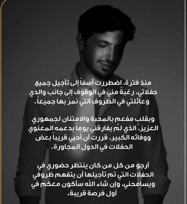 “منذ فترة اضطررت آسفًا إلى تأجيل جميع حفلاتي، رغبة مني في الوقوف إلى جانب والدي وعائلتي في الظروف التي نمر بها جميعًا.. وبقلب مفعم بالمحبة والامتنان لجمهوري العزيز، الذي لم يفارقني يومًا بدعمه المعنوي ووفائه الكبير، قررت أن أحيي قريبًا بعض الحفلات في الدول المجاورة”.