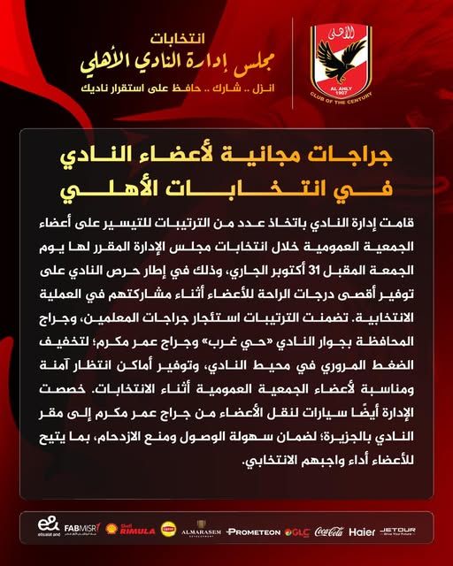 قامت إدارة النادي الأهلي باتخاذ عدد من الترتيبات للتيسير على أعضاء الجمعية العمومية خلال انتخابات مجلس الإدارة المقرر لها يوم الجمعة المقبل 31 أكتوبر الجاري، وذلك في إطار حرص النادي على توفير أقصى درجات الراحة للأعضاء أثناء مشاركتهم في العملية الانتخابية.