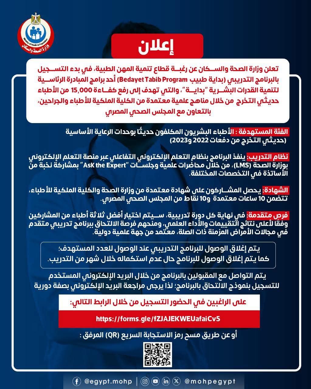 أعلنت وزارة الصحة والسكان، فتح باب التسجيل في البرنامج التدريبي «بداية طبيب – Bedayet Tabib Program»، والذي ينفذه قطاع تنمية المهن الطبية ضمن المبادرة الرئاسية «بداية» لتنمية القدرات البشرية، بهدف رفع كفاءة 15 ألف طبيب من حديثي التخرج من خلال مناهج علمية معتمدة من الكلية الملكية للأطباء والجراحين، وبالتعاون مع المجلس الصحي المصري.