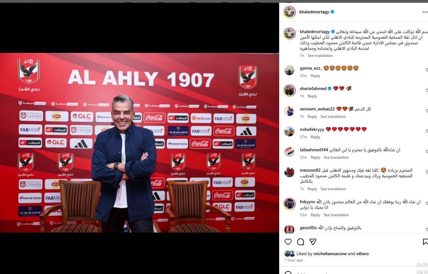 تحيا مصر، وكتب خالد مرتجي عبر حسابه الرسمي" إنستجرام":" بسم الله توكلت علي الله أتمني من الله سبحانه، وتعالي أن انال ثقة الجمعية العمومية المحترمه للنادي الاهلي لكي أمثلها كأمين صندوق في مجلس الادارة ضمن قائمة الكابتن محمود الخطيب وذلك لخدمة النادي الاهلي واعضاءه وجماهيره".