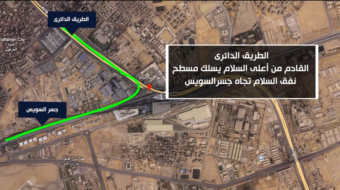 - الطريق الدائرى..القادم من أعلى السلام يسلك مسطح نفق السلام تجاه جسر السويس.