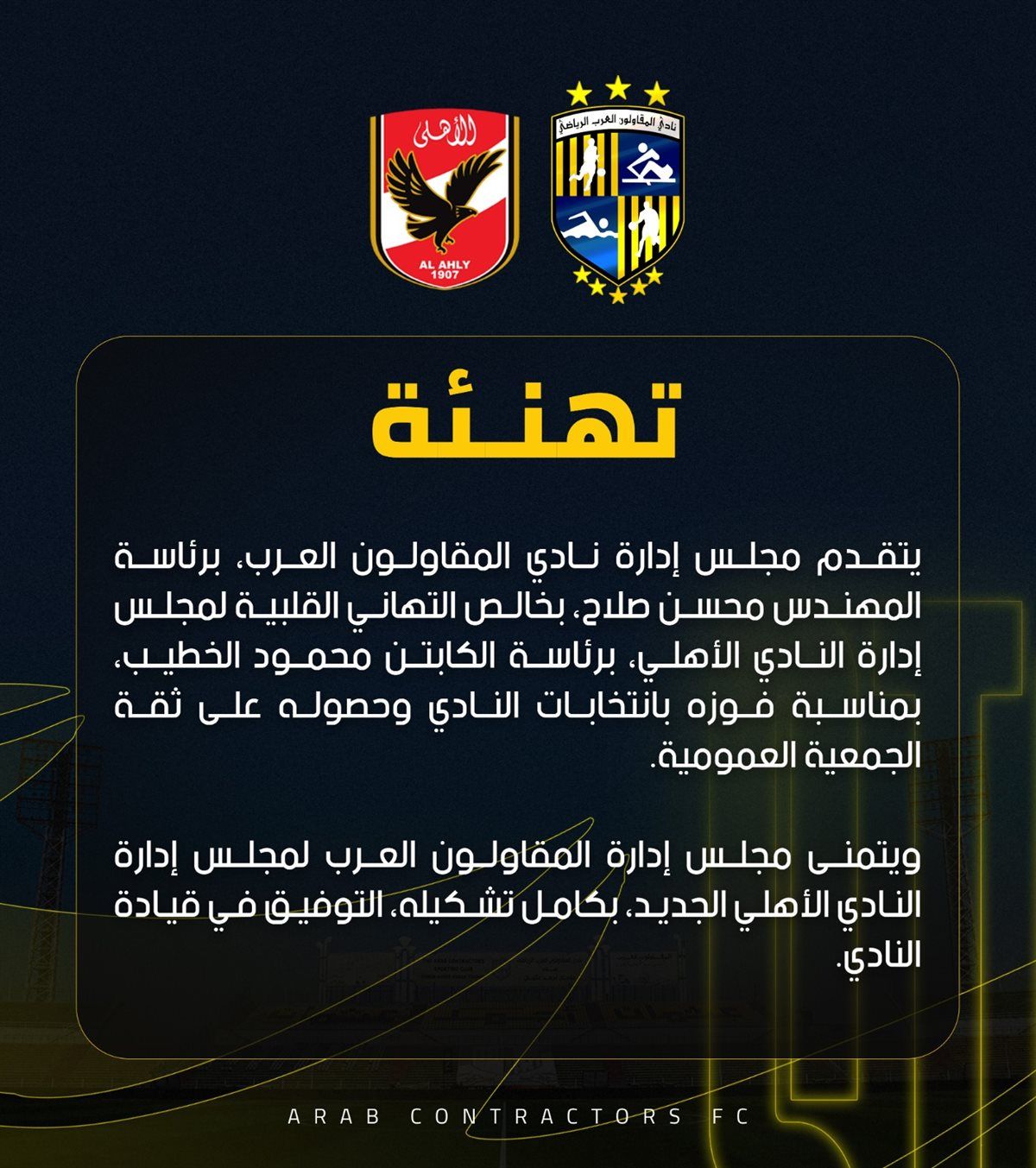 ويتمنى مجلس إدارة المقاولون العرب لمجلس إدارة النادي الأهلي الجديد بكامل تشكيله التوفيق في قيادة النادي.