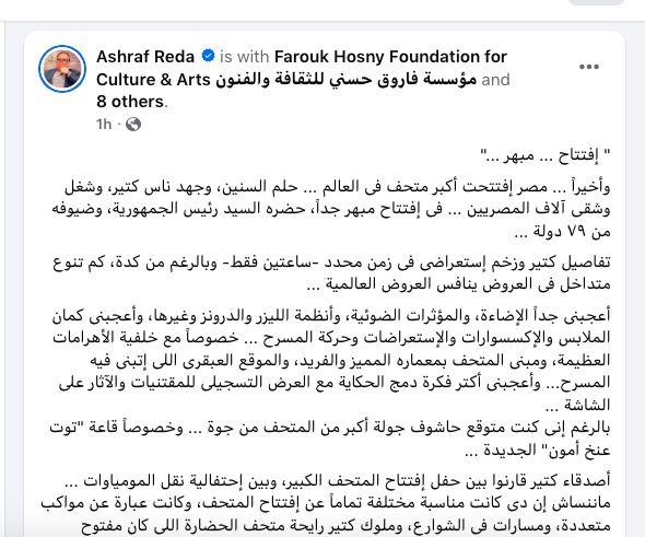 وقال “رضا” في منشور له عبر حسابه الشخصي بموقع التواصل الاجتماعي، “فيسبوك”: “افتتاح مبهر.. وأخيرًا، مصر افتتحت أكبر متحف فى العالم، حلم السنين، وجهد ناس كتير، وشغل وشقى آلاف المصريين فى افتتاح مبهر جدًا، حضره رئيس الجمهورية، وضيوفه من 79 دولة”.