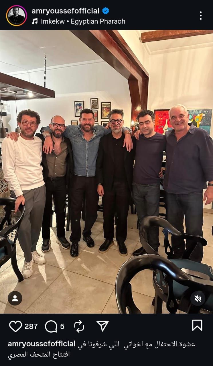 نشر الفنان عمرو يوسف صورة جديدة على حسابه الرسمي عبر إنستجرام جمعته بعدد من صُنّاع حفل افتتاح المتحف المصري الكبير، وعلّق عليها قائلاً: عشوة الاحتفال مع إخواتي اللي شرفونا في حفل افتتاح المتحف المصري الكبير.