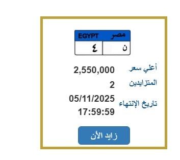 طرحت بوابة مرور مصر الإلكترونية، عددًا من اللوحات المميزة داخل المُزايدة التي تتم إلكترونيًا عبر البوابة الرسمية لمرور مصر، ومن ضمن اللوحات التي تُجرى المُزايدة عليها، لوحة تحمل رقم (ن - 4) ووصل سعرها حتى الآن 2مليون و500 ألف جنيه وتنتهي المزايدة عليها 5 نوفمبر الجاري.