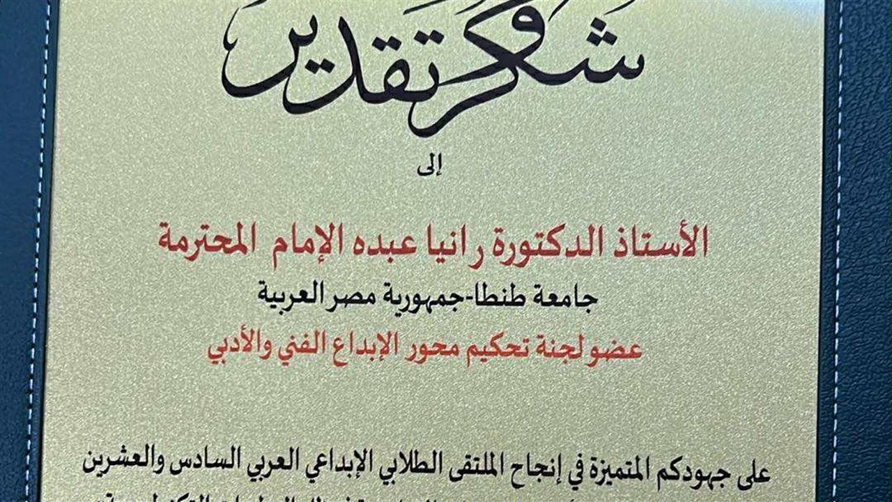 كرم الملتقى الطلابي الإبداعي العربي السادس والعشرين الدكتورة رانيا عبده الإمام عميد كلية التربية النوعية بجامعة طنطا على هامش فعاليات المؤتمر نظرا لتميزها "محكما في محور الإبداع الفني والأدبي ضمن فعاليات الملتقى".