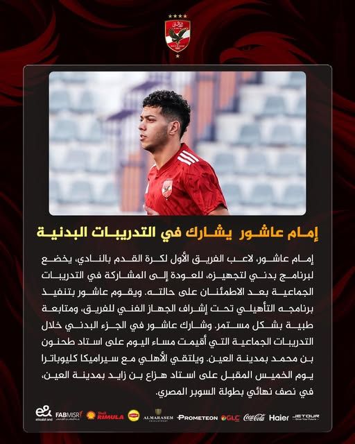 يخضع إمام عاشور لاعب الفريق الأول لكرة القدم بالنادي الأهلي، لبرنامج بدني لتجهيزه، للعودة إلي المشاركة في التدريبات الجماعية ب الأطمئنان على حالته.