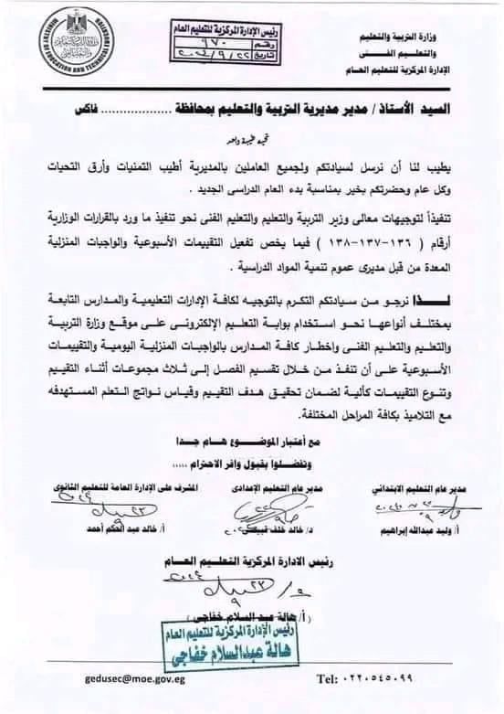 كشفت وزارة التربية والتعليم والتعليم الفني من خلال مستند رسمي لها، أنه تنفيذا لتوجيهات وزير التربية والتعليم محمد عبداللطيف بشأن التقييمات الأسبوعية والواجبات المنزلية يجب على كل الإدارات التعليمية وجميع المدارس استخدام بوابة التعليم الإلكتروني على موقع الوزارة وإخطار كافة المدارس بالواجبات المدرسية والتقييمات الأسبوعية على أن تنفذ من خلال تقسيم الفصل إلى ثلاث مجموعات أثناء التقييم وتتنوع التقييمات بما يضمن تحقيق هدف التقييم وقياس نواتج التعليم المستهدفة مع التلاميذ بكافة المراحل.