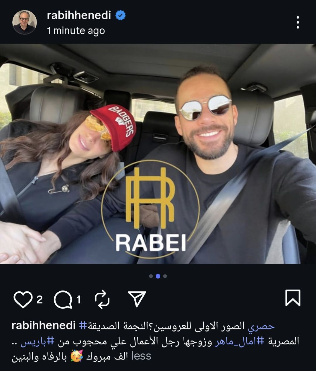 وعلق ربيع هنيدي على الصور عبر حسابه الرسمي على موقع تبادل الصور والفيديوهات إنستجرام وكتب: الصور الأولى للعروسين النجمة الصديقة المصرية آمال ماهر وزوجها رجل الأعمال علي محجوب من باريس، ألف مبروك بالرفاه والبنين.