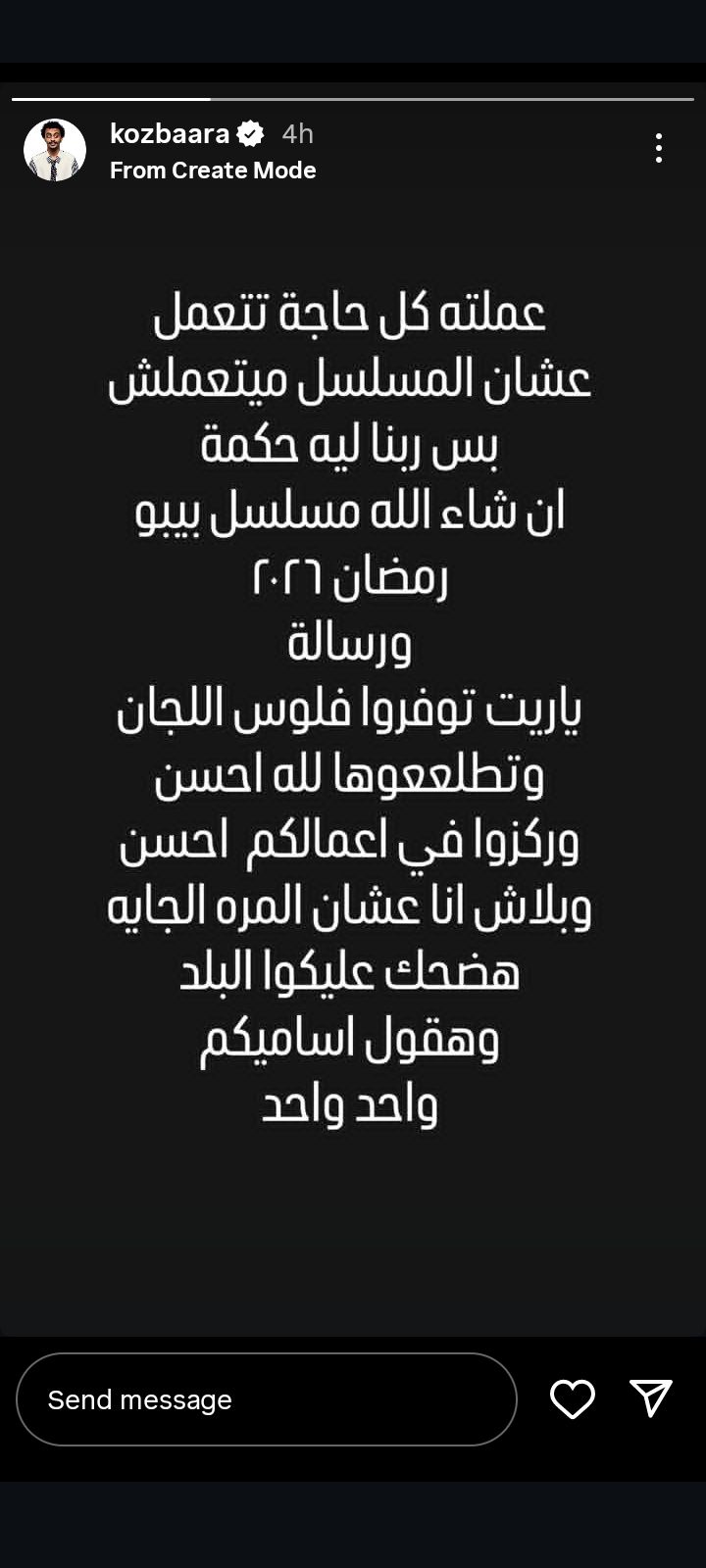وكتب كزبرة في منشور رصده موقع تحيا مصر على حسابه الرسمي بموقع تبادل الصور والفيديوهات انستجرام: "عملتوا كل حاجة تتعمل عشان المسلسل ميتعملش بس ربنا ليه حكمة، إن شاءالله مسلسل بيبو، رمضان 2026".