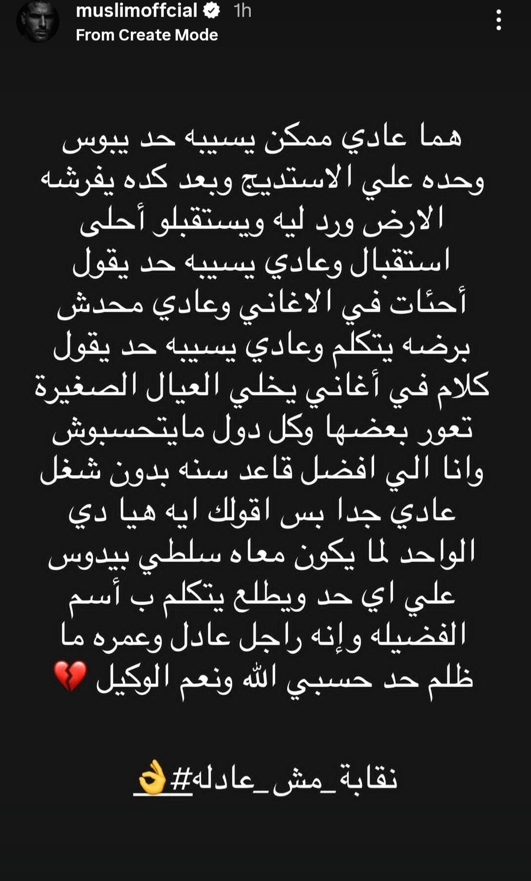 جاءت تصريحات مغني المهرجانات مسلم عبر حسابه الرسمي على موقع إنستجرام، حيث نشر رسالة مطولة عبّر فيها عن استيائه مما وصفه بـ«الكيل بمكيالين» داخل النقابة، قائلًا: "هما عادي ممكن يسيبوا حد يبوس واحدة على المسرح، وبعدها يفرشوله الأرض ورد ويستقبلوه أحسن استقبال، وعادي كمان لما حد يقول إيحاءات في الأغاني أو كلام يخلي العيال الصغيرة تأذي بعضها، محدش بيتكلم، بس أنا اللي أفضل قاعد سنة من غير شغل! اللي معاه سلطة بيدوس على الناس، ويتكلم باسم الفضيلة وهو مش عادل. حسبي الله ونعم الوكيل.. نقابة مش عادلة"، و أثار حديث مسلم الذي رصده موقع تحيا مصر موجة واسعة من التفاعل على مواقع التواصل الاجتماعي، بين مؤيد لحقه في العودة للغناء، ومعارض يرى أن النقابة لها مبرراتها في قراراتها التنظيمية.