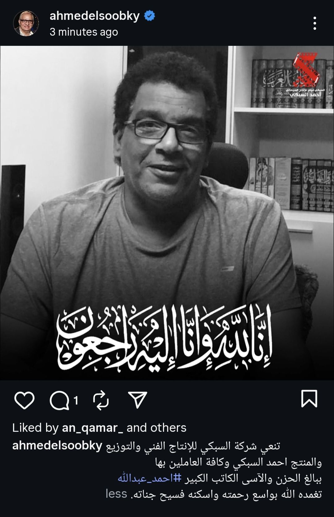 وكتب أحمد السبكي في منشوره الذي يرصده موقع تحيا مصر: تنعي شركة السبكي للإنتاج الفني والتوزيع والمنتج احمد السبكي وكافة العاملين بها ببالغ الحزن والأسى الكاتب الكبير احمد عبدالله تغمده الله بواسع رحمته واسكنه فسيح جناته.