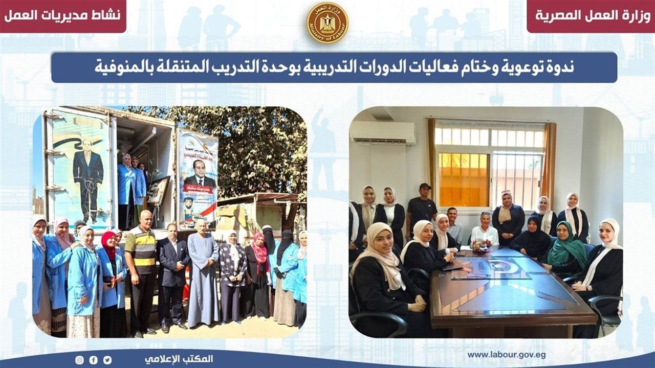 في نفس السياق، اختتمت مديرية العمل بالمنوفية فعاليات الدورات التدريبية التي نظمتها بوحدة التدريب المتنقلة في قرية سلامون بمركز الشهداء، حيث تم تدريب 20 متدربًا في مجالات التفصيل والخياطة والكهرباء، وتستمر هذه المبادرات في تأهيل الشباب للعمل في مختلف المهن الفنية التي تلبّي احتياجات سوق العمل المحلي.