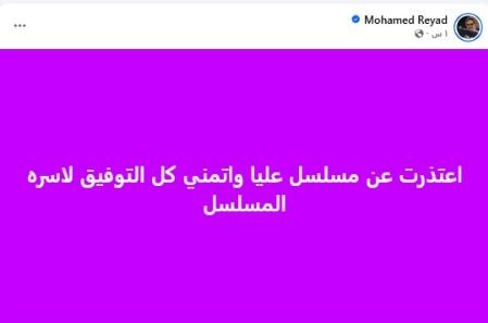 وكتب محمد رياض في منشوره الذي يرصده موقع تحيا مصر: اعتذرت عن مسلسل عليا وأتمنى كل التوفيق لأسرة المسلسل.