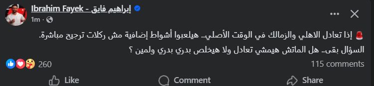 تحيا مصر، وكتب إبراهيم فايق عبر حسابه الرسمي"فيس بوك": إذا تعادل الاهلي والزمالك في الوقت الأصلي.. هيلعبوا أشواط إضافية مش ركلات ترجيح مباشرة".