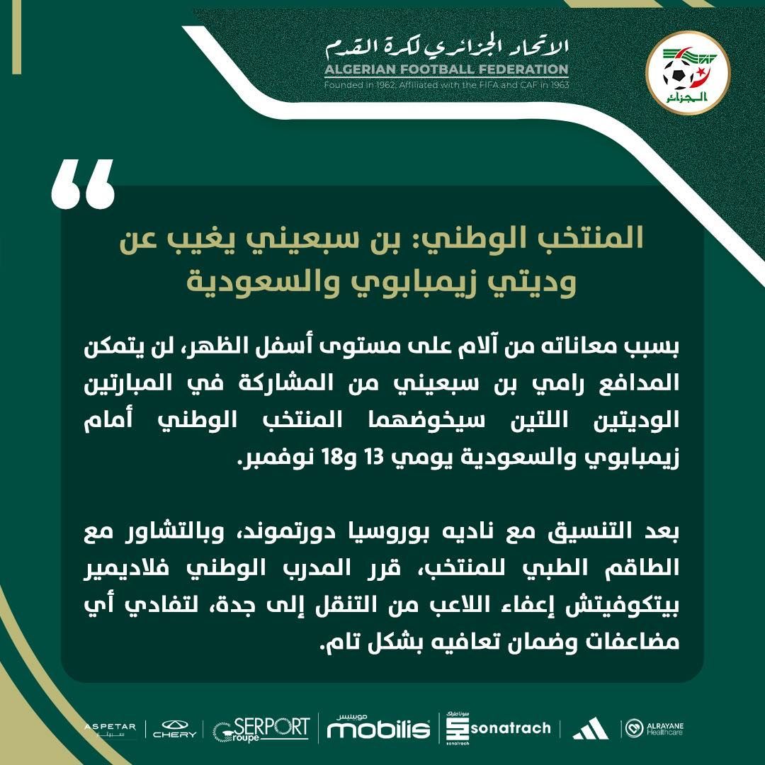 وأعلن الاتحاد الجزائري لكرة القدم، في بيان له اليوم الأحد، عن معاناة بن سبعيني، من آلام على مستوى أسفل الظهر.