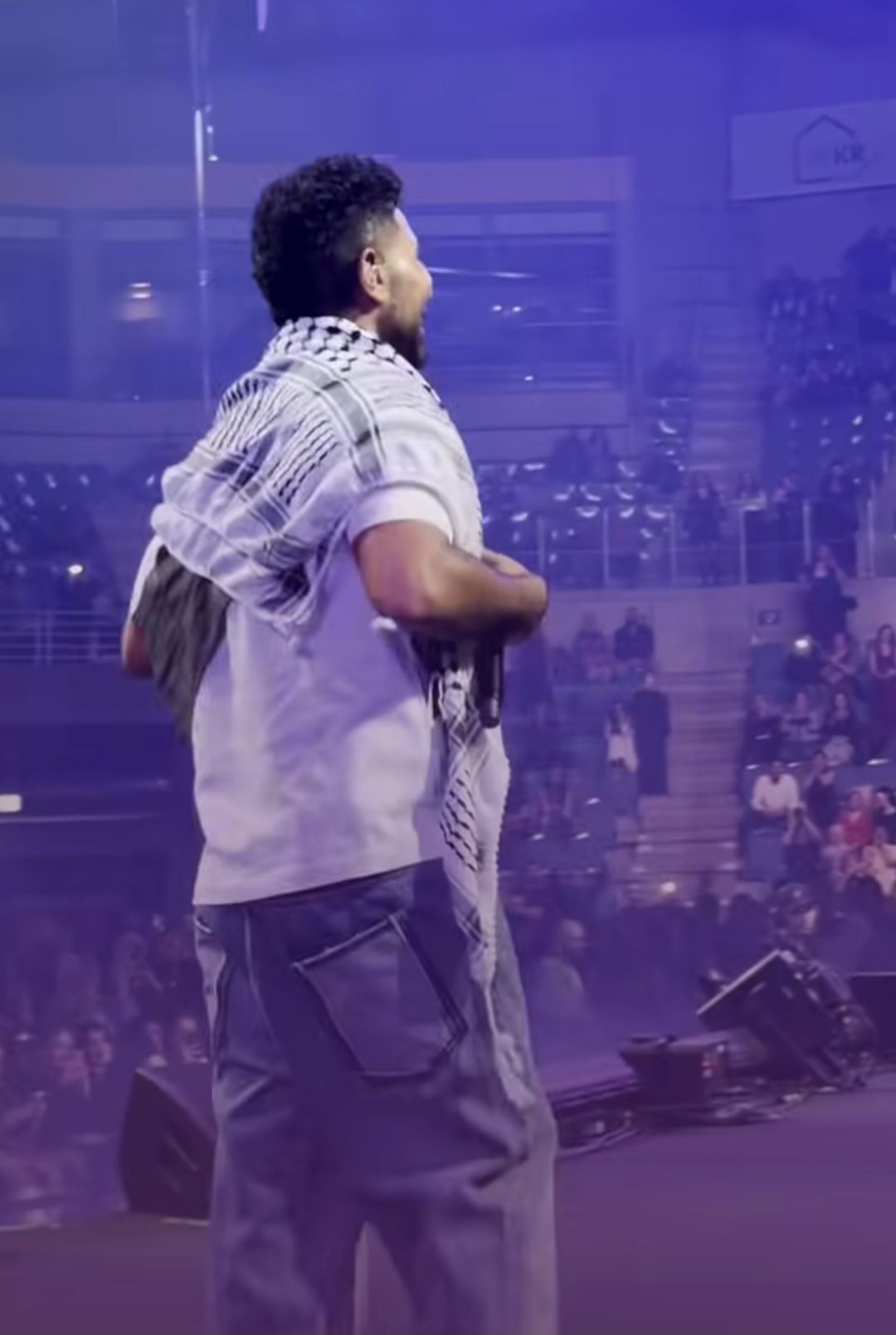 وظهر سعد في الفيديو وهو يرفع العلم المصري والكوفية الفلسطينية معًا على المسرح، بينما يهتف الجمهور بحرارة تضامنًا مع الشعب الفلسطيني، في مشهد مؤثر عبّر عن وحدة الشعوب العربية.